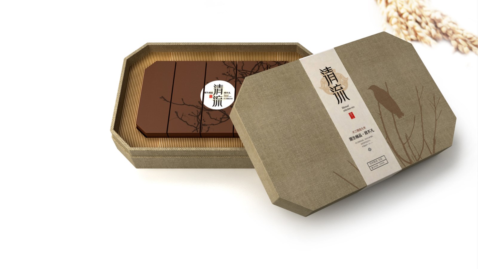 智圆行方设计团队将同丰瑶珍高端产品不同意境,进行了排序,分别给予不同的单品命名:朴耕、原生、清流、雨谷;通过命名将大米在自然生长过程中的环境条件、状态提取出来,用意蕴绵长的词语组合,让受众群体自然而然的感受到产品的原生态、稀有,清洌的纯正的天然品质,拉伸产品的附加价值。天然原生概念,以最简洁的语言表达“天然原生概念”与客户分享“尊重自然、低碳乐活”的生活态度,契合生态产品的气质特征。