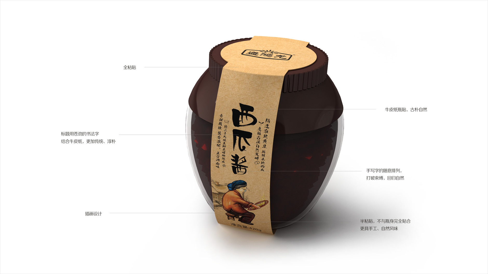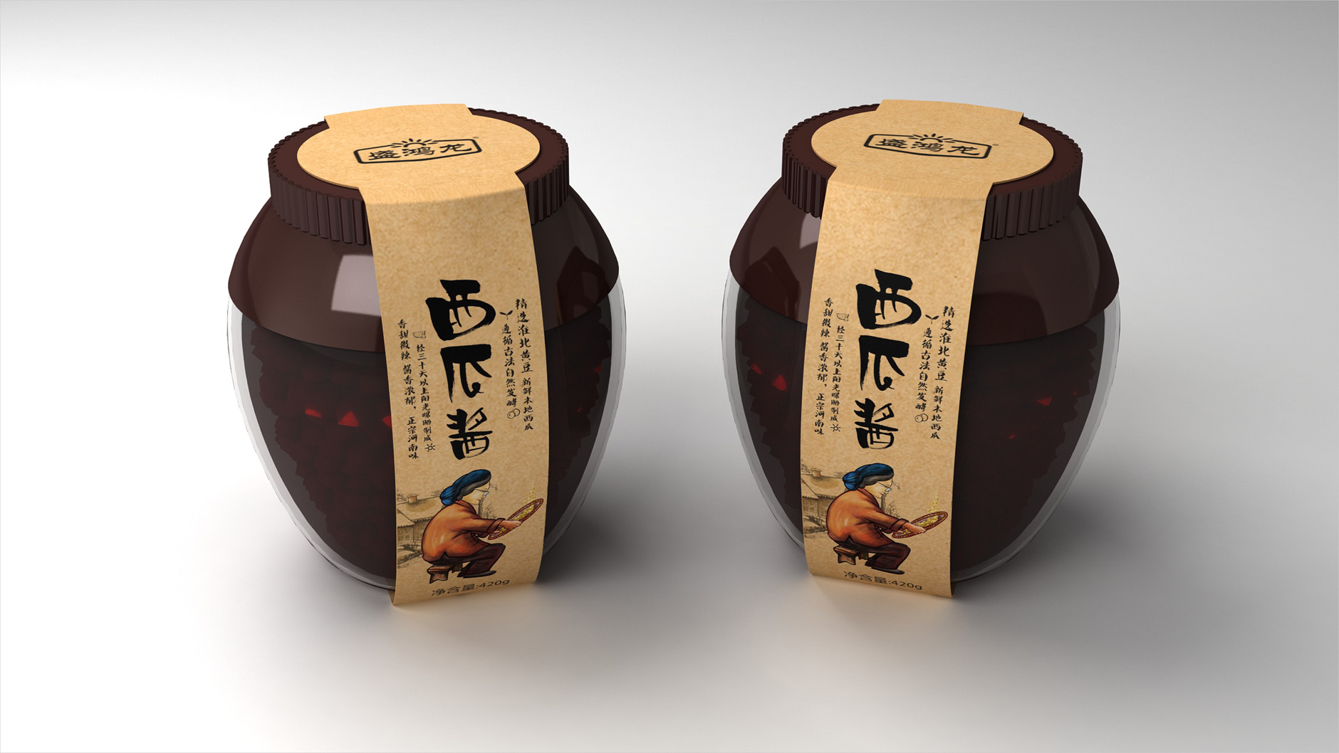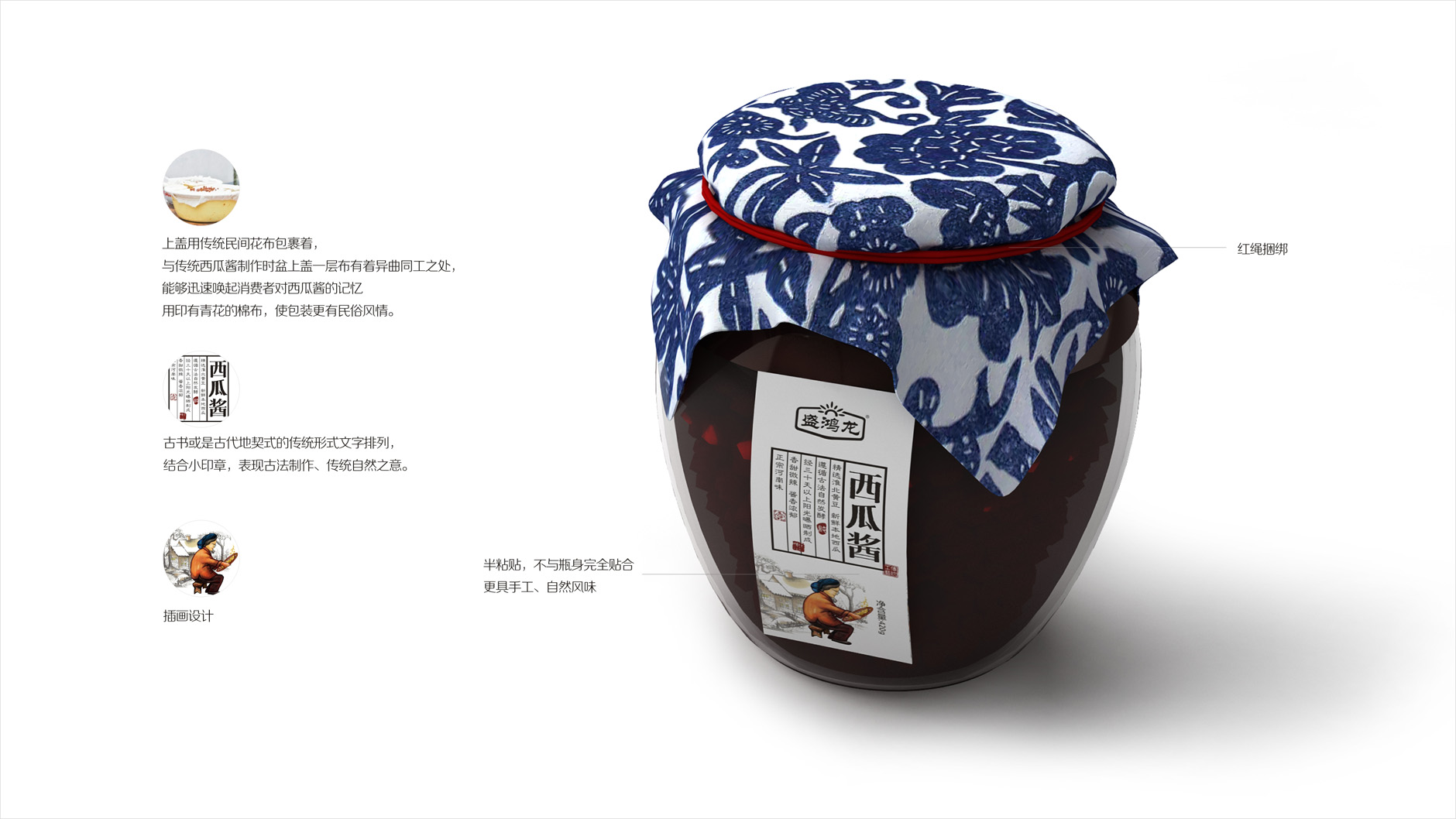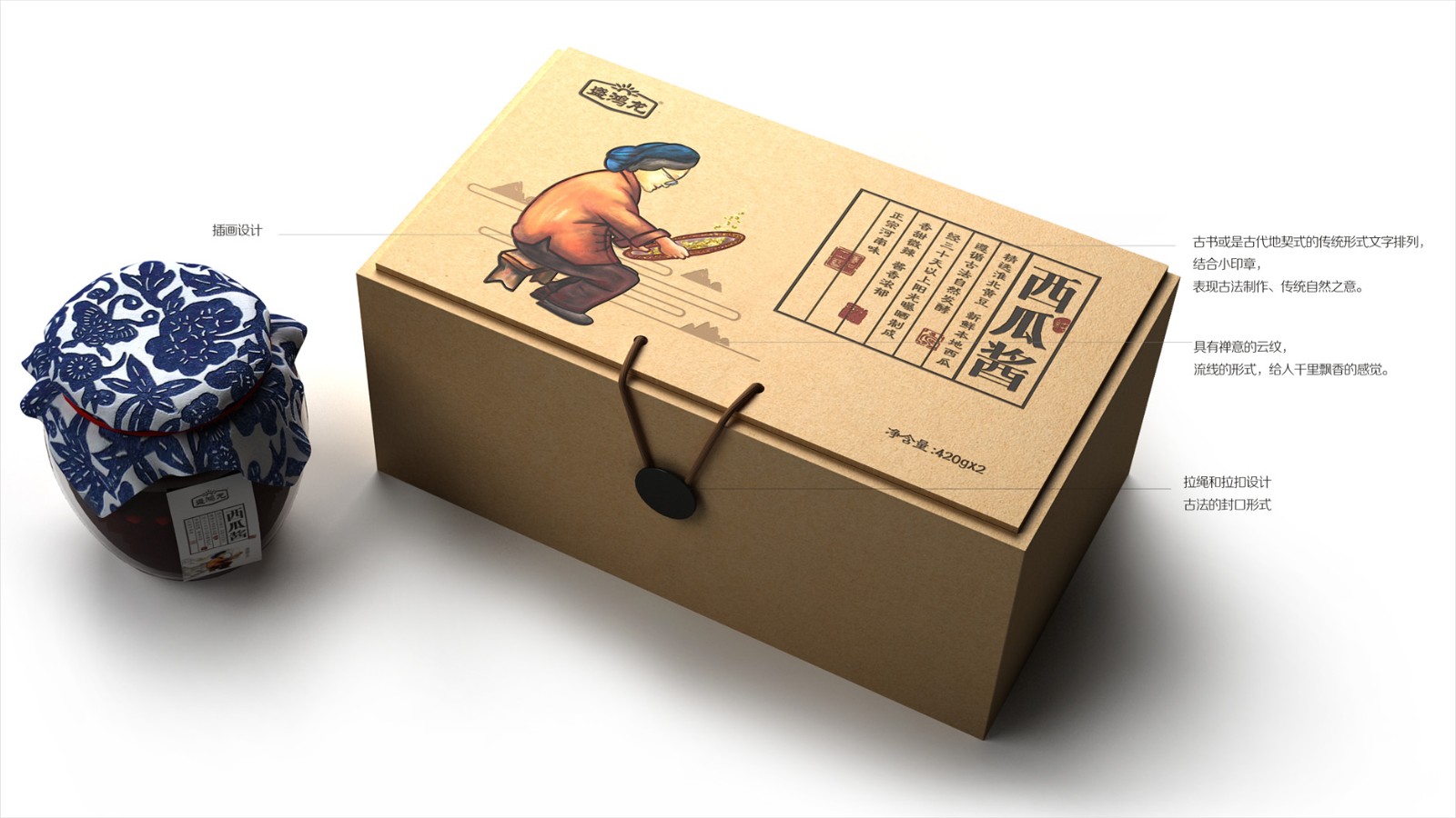 盛鸿龙西瓜酱 浓厚的思乡情怀,熟悉的家乡味道! 品牌项目:西瓜酱是我们对家乡的一种浓厚的情怀,是记忆中熟悉的家乡味道。记忆中每蓬盛夏之际,家里的奶奶或者外婆就会为我们制作美味的西瓜酱,我们将这种记忆提炼出来,创作出一个戴眼镜的和蔼老奶奶拣豆子的插画形象,和农家小院的结合,并赋予古朴的色彩,希望能够迅速唤起我们对于西瓜酱这种具有浓烈家乡味道的记忆。